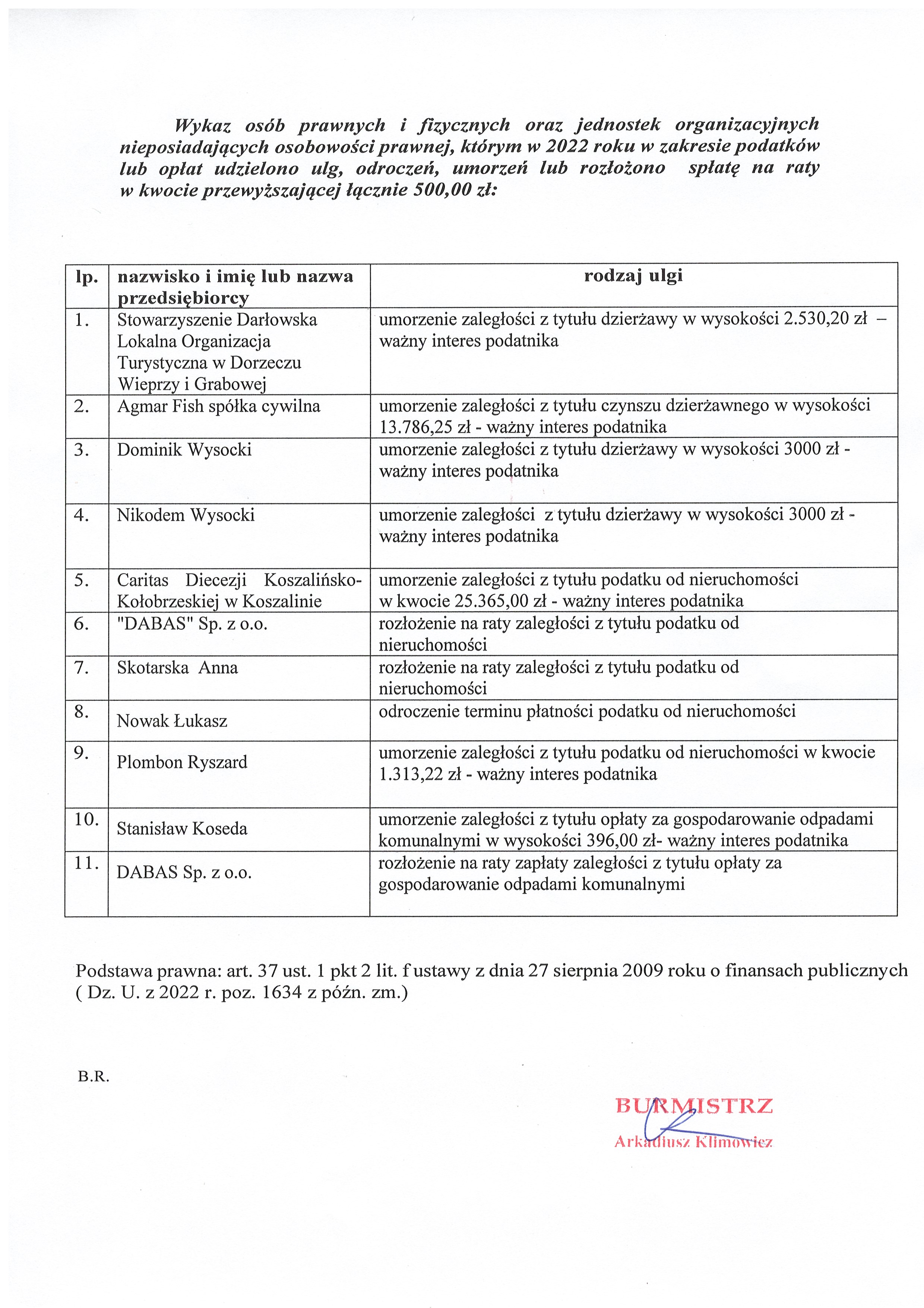 Wykaz udzielonych ulg w roku 2022