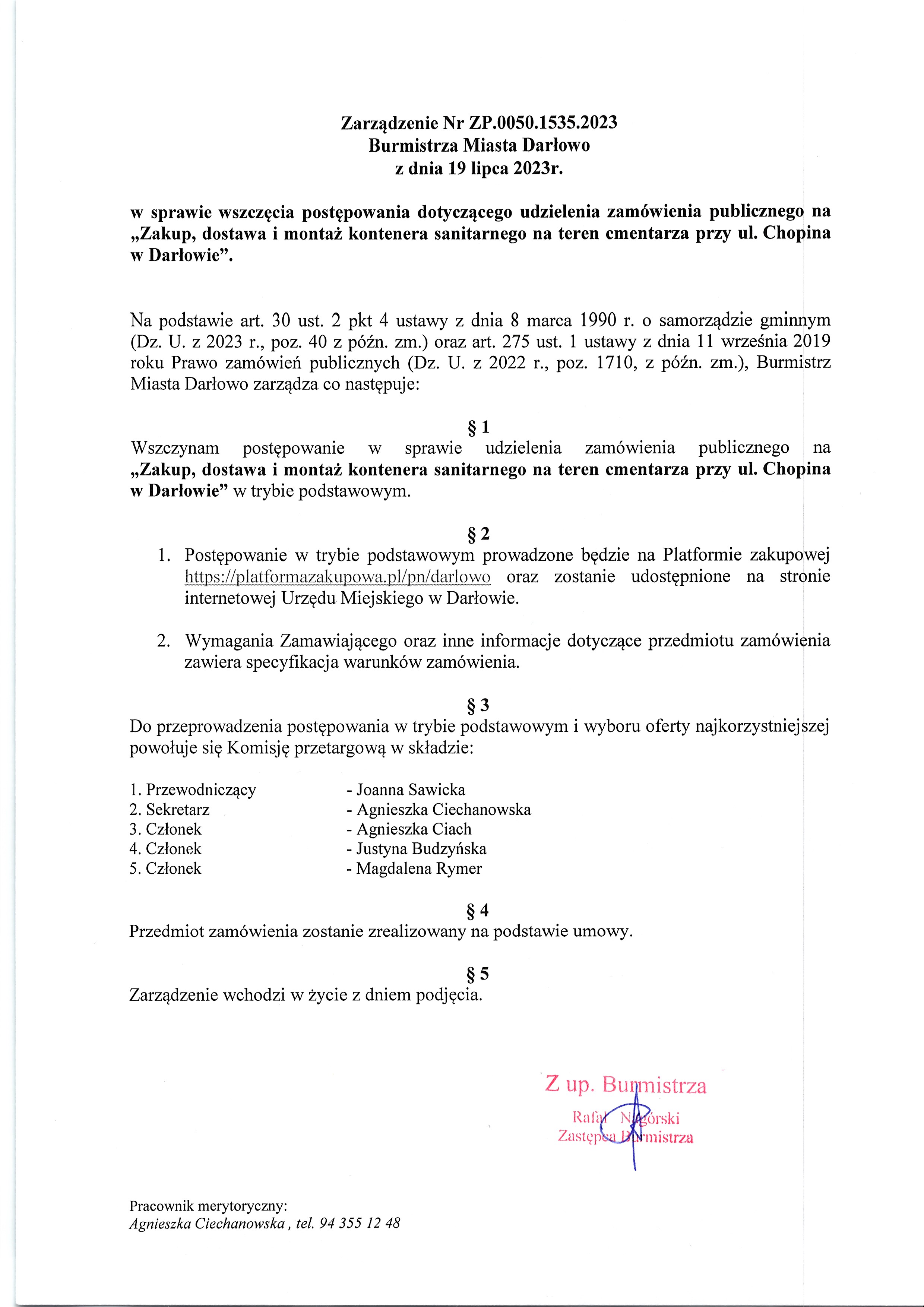ws. wszczęcia postępowania dot. udzielenia zamówienia publicznego na "Zakup, dostawa i montaż kontenera na teren cmentarza przy ul. Chopina w Darłowie".
